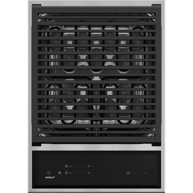 Температура регулируется с помощью фирменных поворотных переключателей Wolf, что обеспечивает точный контроль процесса. Специальные чугунные решётки аккумулируют и равномерно передают тепло, формируя характерные следы прожарки на продуктах.