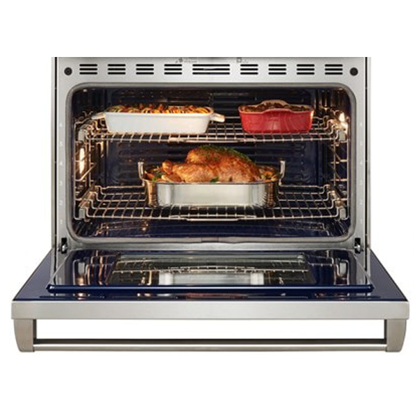 Цветной сенсорный экран интуитивно понятен и удобен. По окончании работы он незаметно скрывается на лицевой панели. Переключатели управления со светодиодной подсветкой загораются при использовании, указывая, какие горелки активны. Духовка имеет функции самоочистки (пиролиза), отложенного старта, готовки по расписанию и опцию «Шаббат». Внутри они покрыты синим фарфором, устойчивым к температурному и механическому воздействиям, массивные дверцы легко и плавно открываются благодаря гидравлическому механизму. Благодаря выверенному дизайну, кухонный блок выглядит презентабельно и стильно.