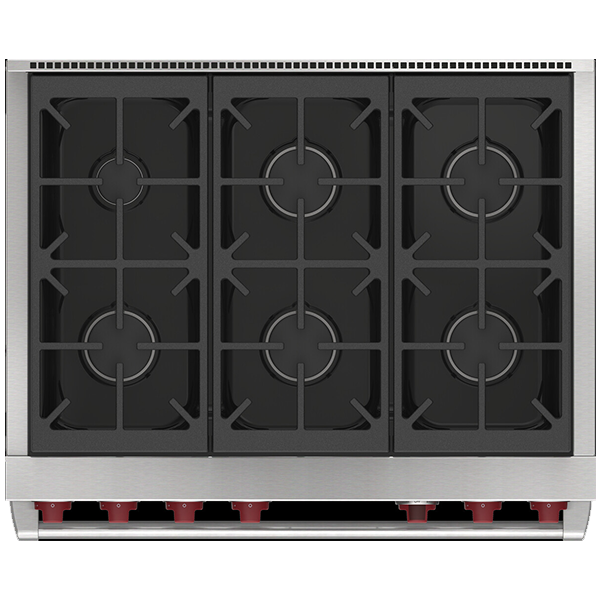 Газовая варочная поверхность состоит из шести горелок, мощностью от 2,7 кВ (для топления) до 5,3 кВ (для быстрого закипания и интенсивной обжарки) . Запатентованная двухуровневая конструкция газовой горелки Wolf позволяет максимально точно контролировать температуру нагрева. Система реподжига автоматически зажигает горелку при её заливе.