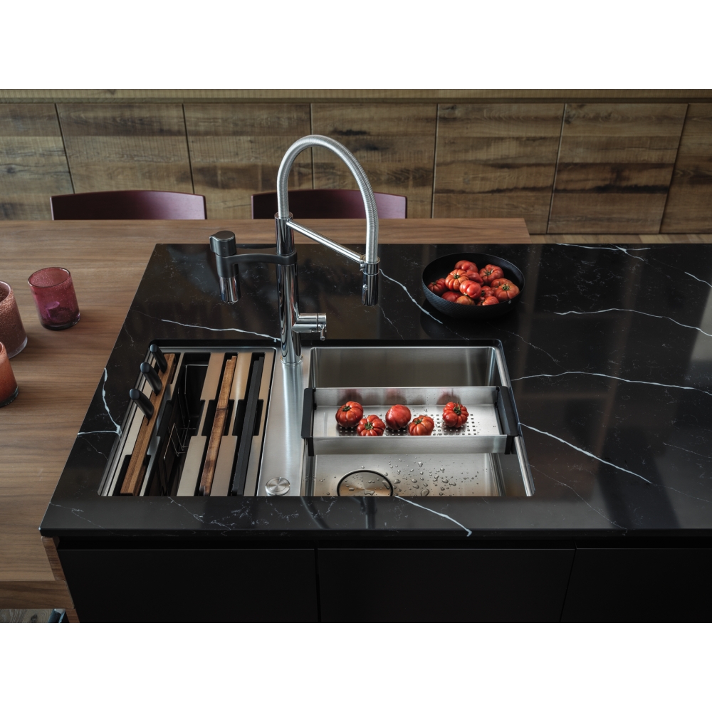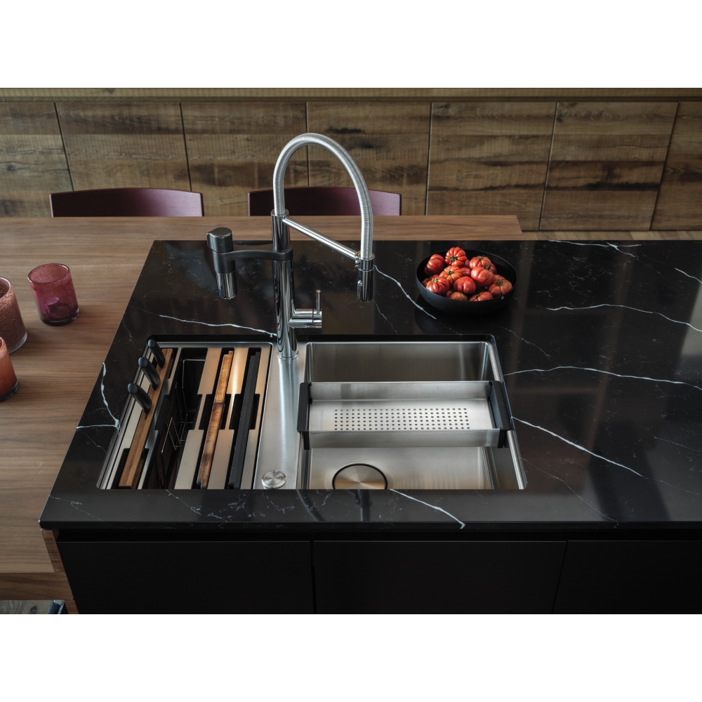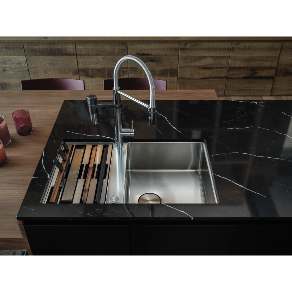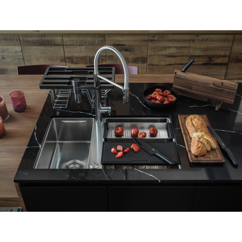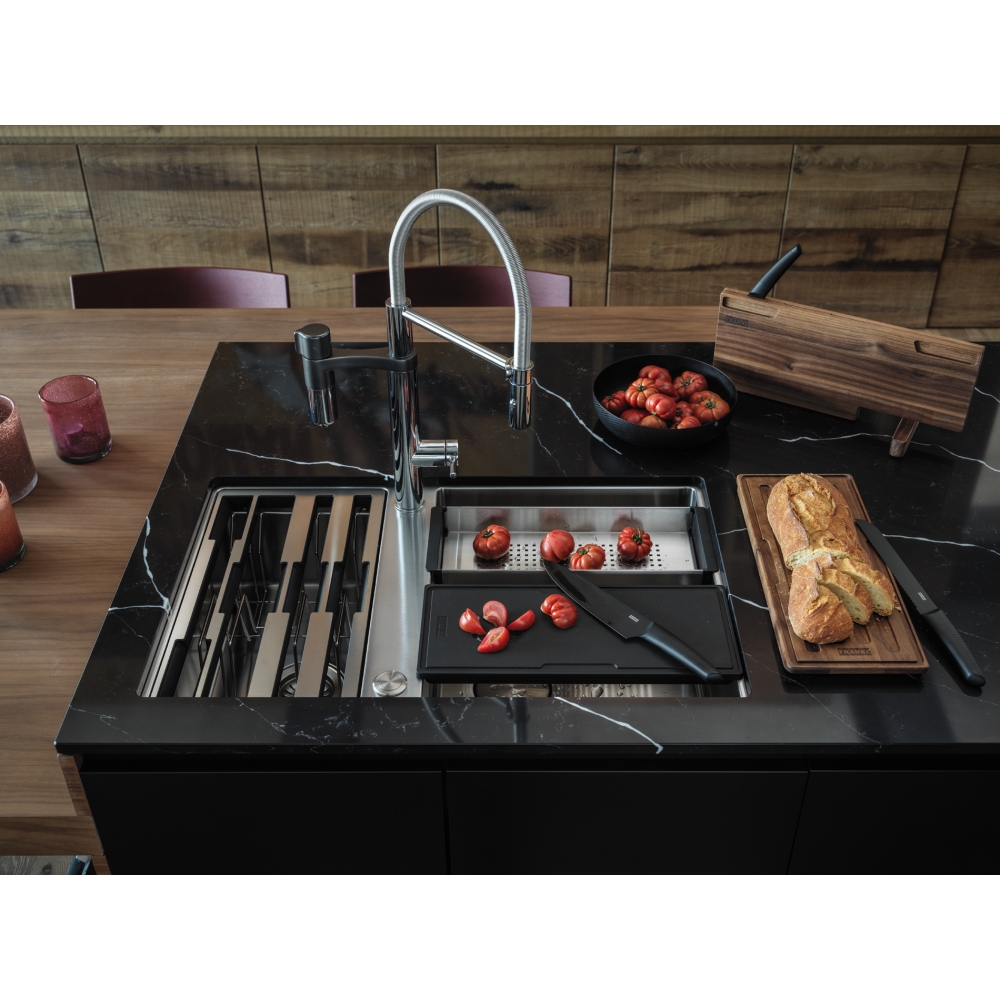 Вентиль-автомат и сифон , кнопка Easy Click в отделке нерж.сталь, круглая декоративная крышка для слива в большой чаше (В наборе разделочные доски (пластиковая и деревянная), миска из нержавеющей стали, 3 ножа (специально для хлеба, овощей, мяса/рыбы, деревянный держатель для ножей)