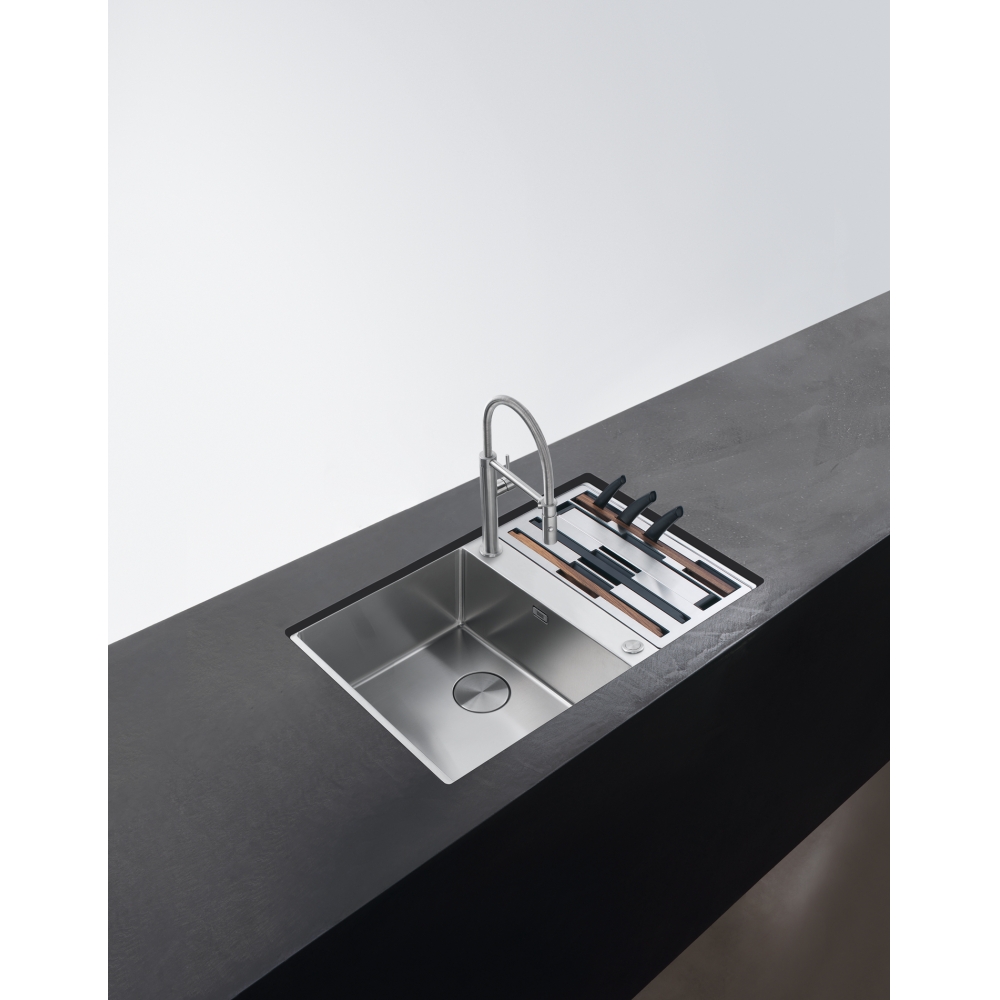 Мойка из нержавеющей стали Franke Box Center BWX 120-41-27 для шкафа 90 см. Выполнена из полированной стали марки AISI 304. Мойка укомплектована: 2 разделочными досками, миской из нержавеющей стали, тремя ножами (для хлеба, овощей, мяса/рыбы), деревянным держателем для ножей.