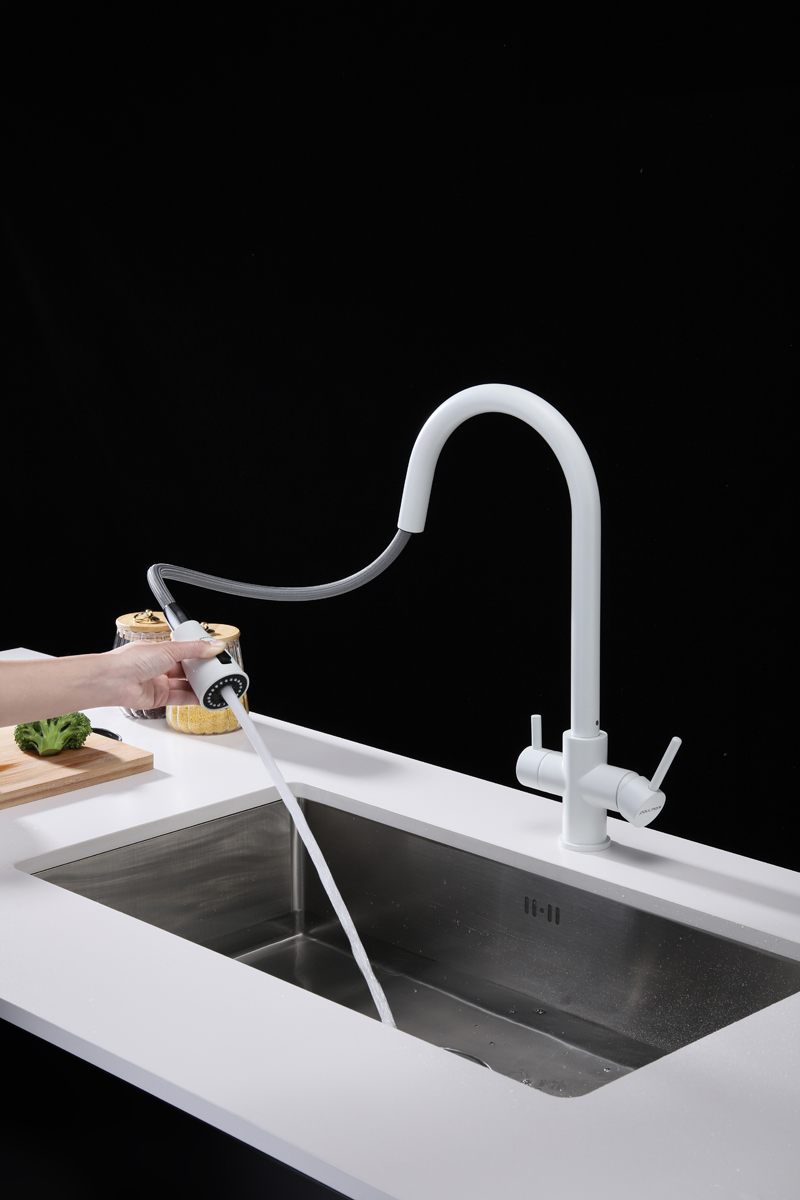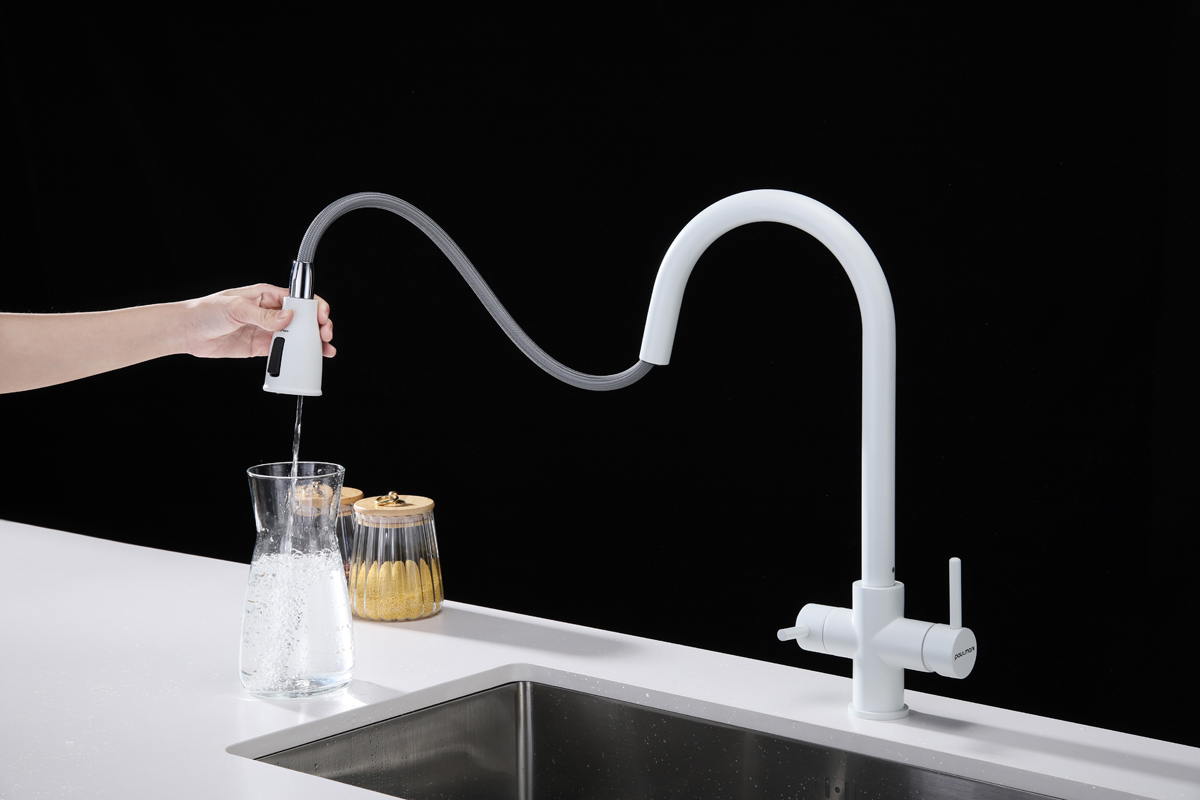 Смеситель LANGE оснащен функциями подключения фильтра питьевой воды, выдвижения излива и двумя режимами подачи водопроводной воды: струя и душ.