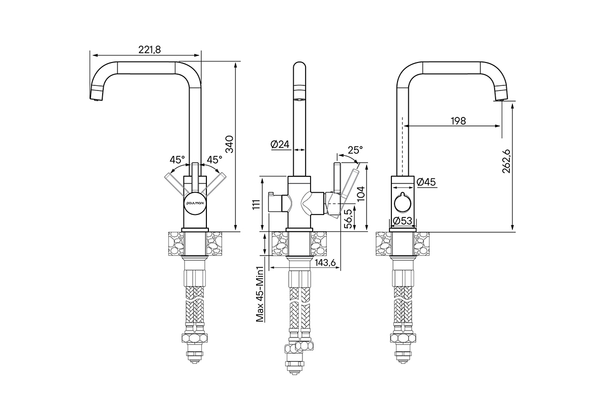 - Гибкая подводка для воды 40 см; - Комплект крепления; - Переходник цанга для подключения системы фильтрации питьевой воды.