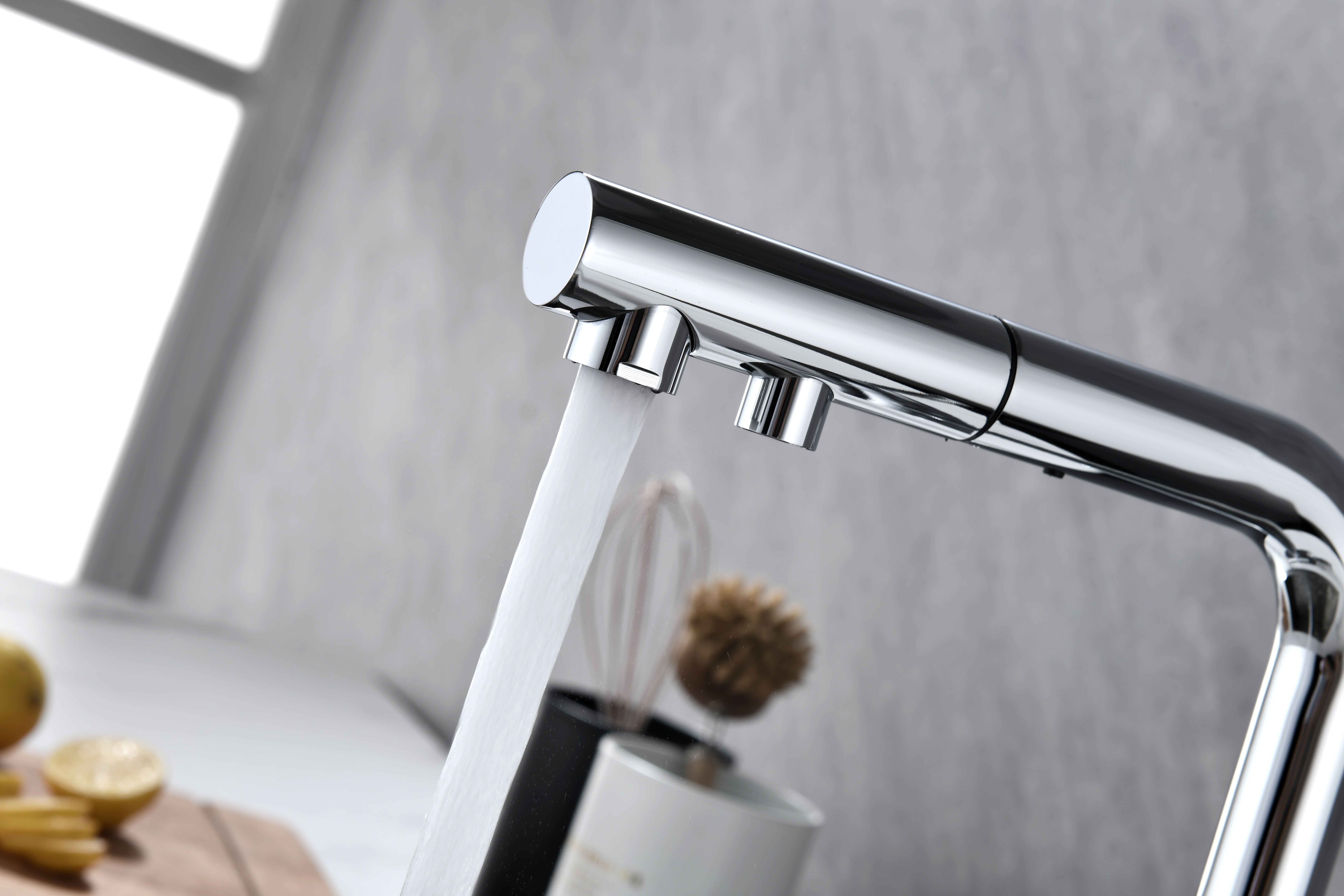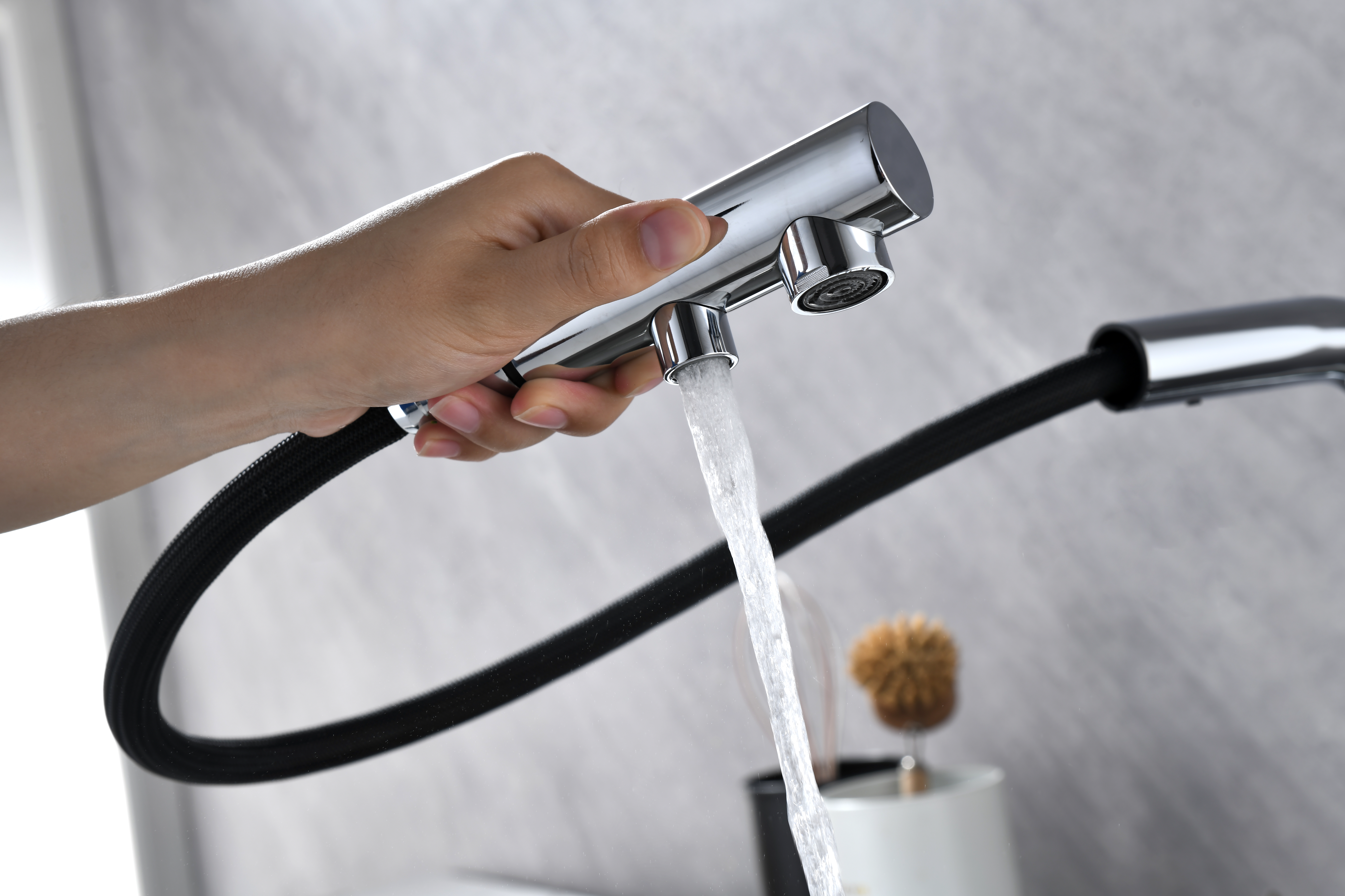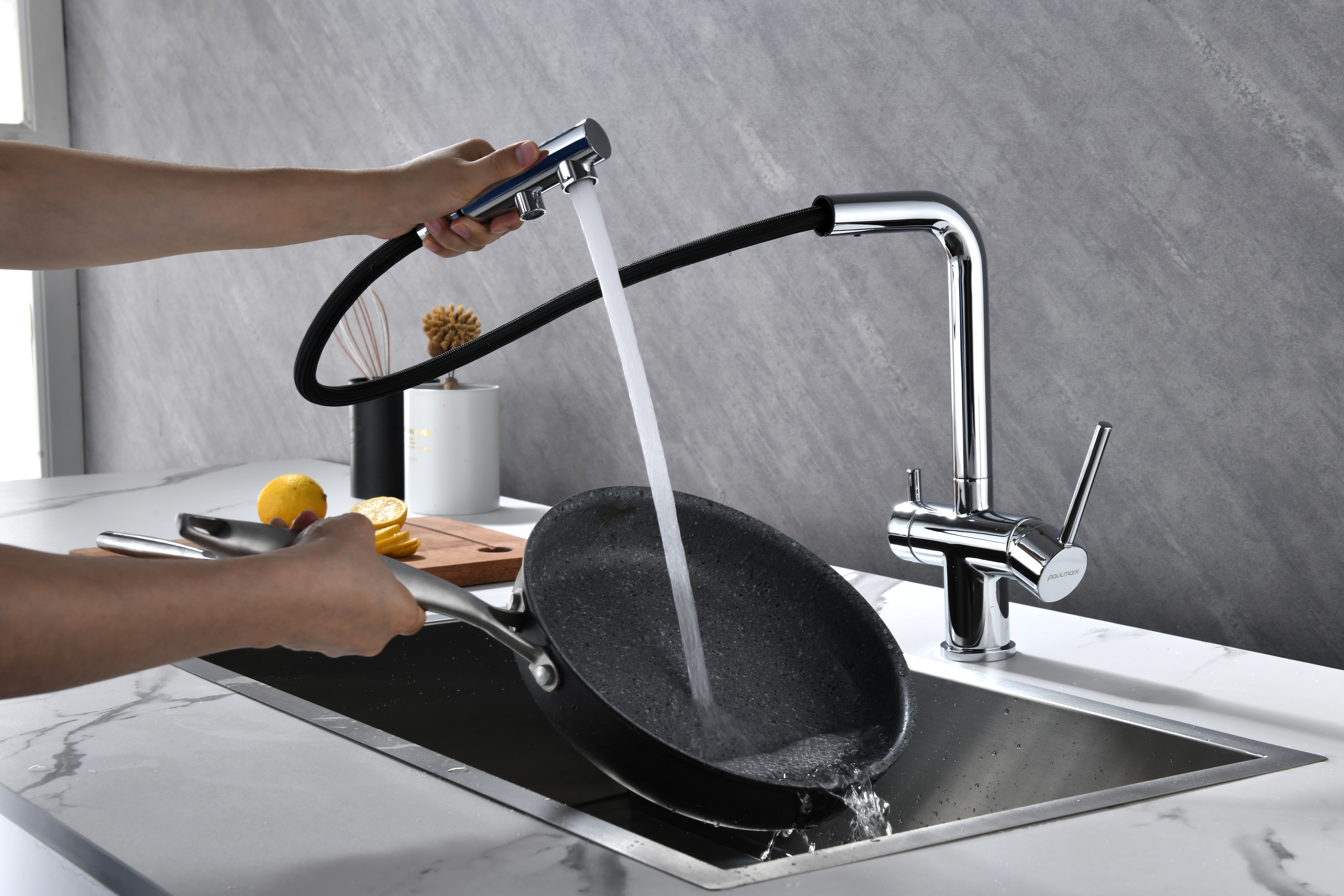 Смеситель оснащен гибким выдвижным изливом из нейлоновой оплетки, которая обладает отличной устойчивостью к истиранию и разрушению. Данная техническая особенность расширяет рабочую зону смесителя, позволяя пользоваться им с удобством в больших мойках, мойках с двумя чашами, или наполнять водой ёмкость на столе рядом с мойкой, в том числе питьевой водой.