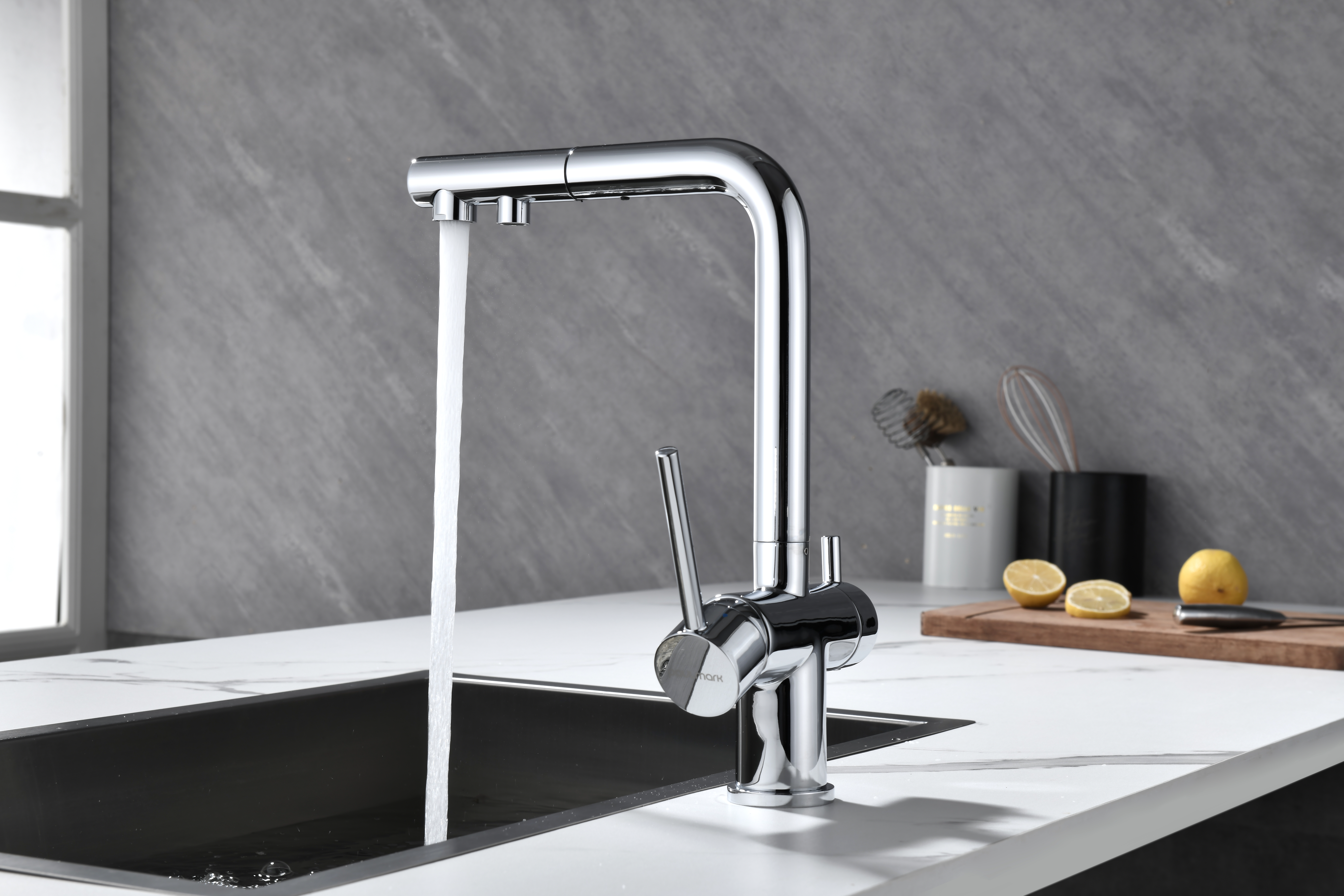 SERPENTINE оснащён функцией TRINKWASSER - излив смесителя имеет встроенный независимый канал для питьевой воды из фильтра, таким образом питьевая и водопроводная вода не смешиваются. Управление питьевой водой осуществляется отдельным рычагом, расположенным слева. Для пуска водопроводной воды используется большой рычаг справа.