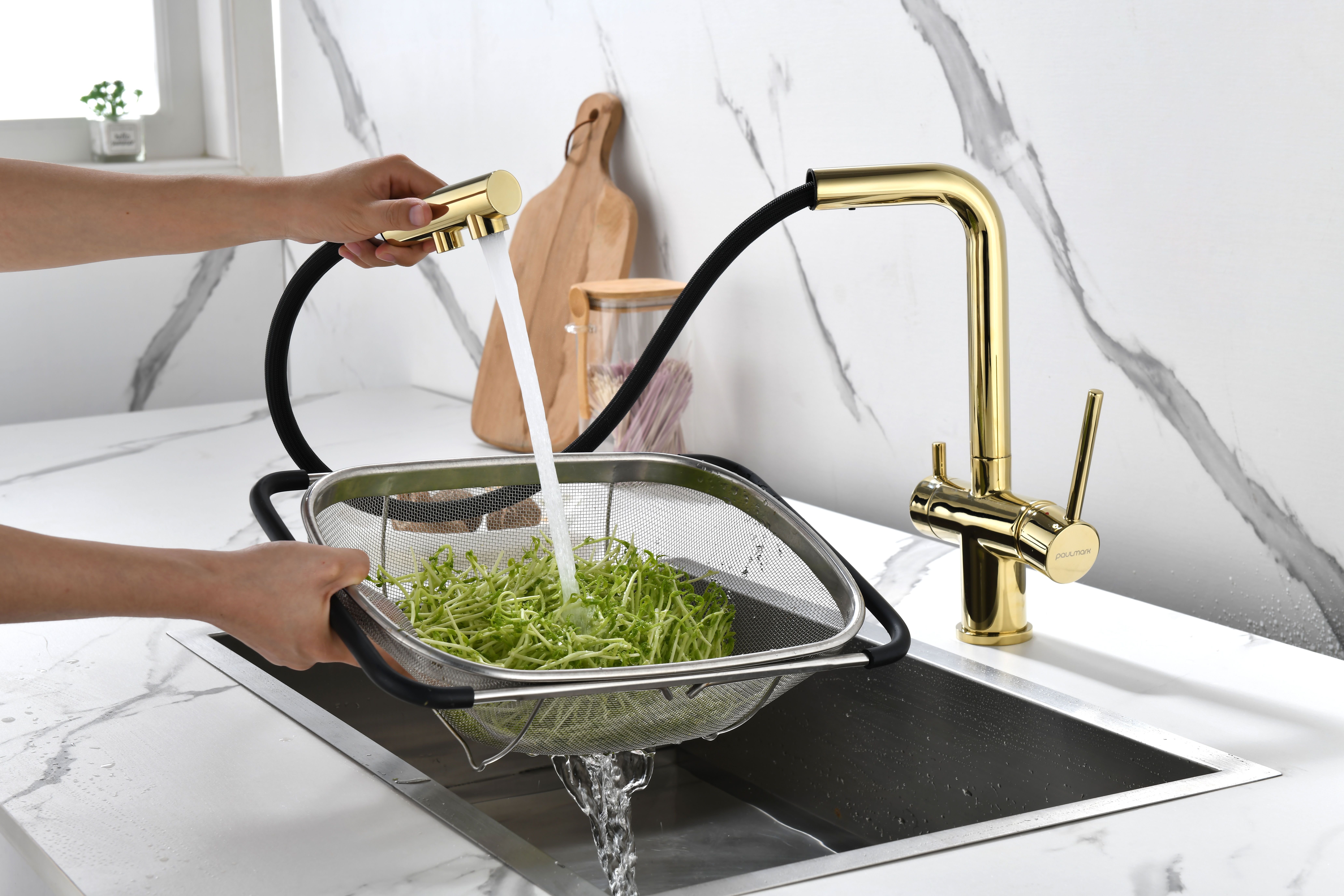 Смеситель оснащен гибким выдвижным изливом из нейлоновой оплетки, которая обладает отличной устойчивостью к истиранию и разрушению. Данная техническая особенность расширяет рабочую зону смесителя, позволяя пользоваться им с удобством в больших мойках, мойках с двумя чашами, или наполнять водой ёмкость на столе рядом с мойкой, в том числе питьевой водой.