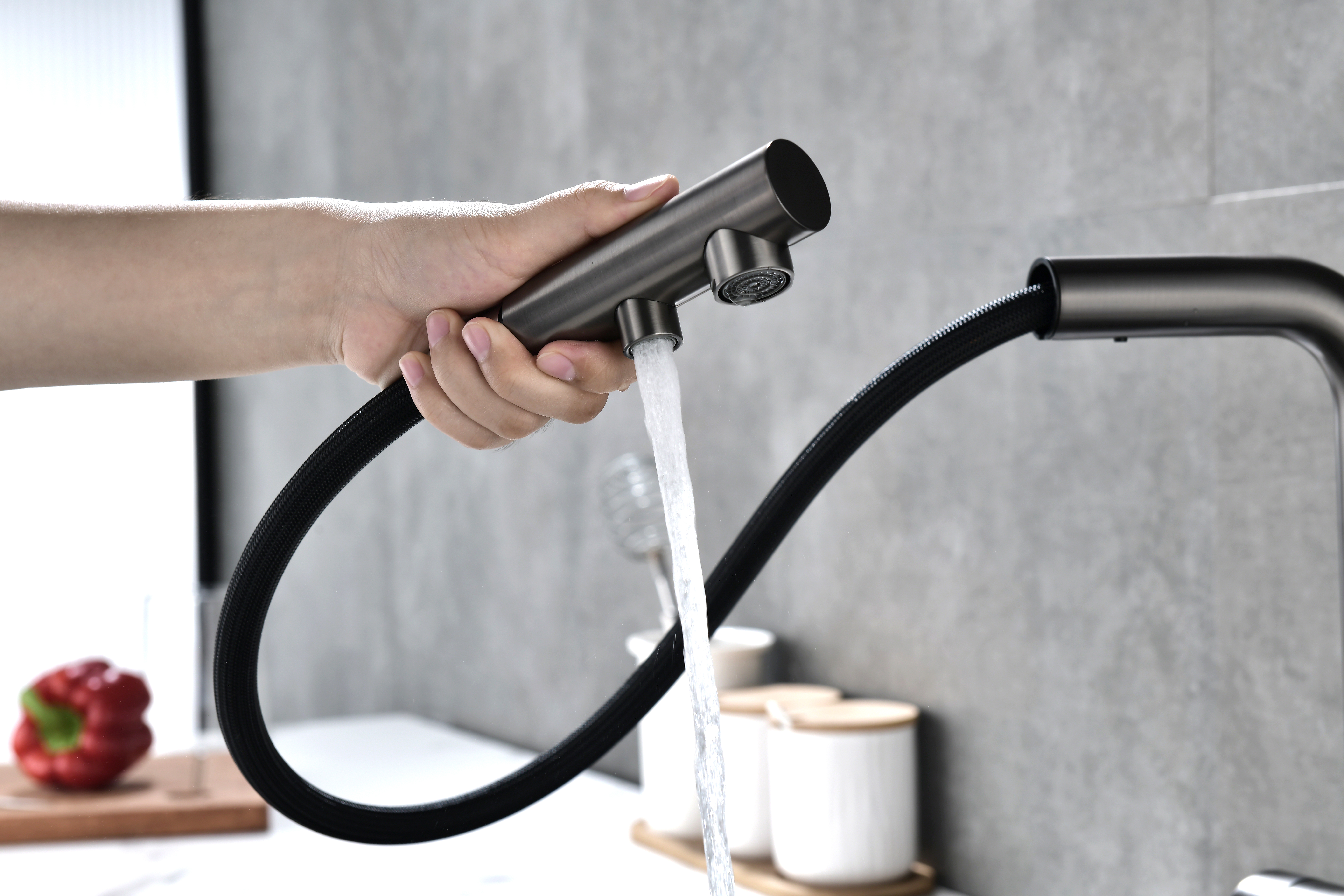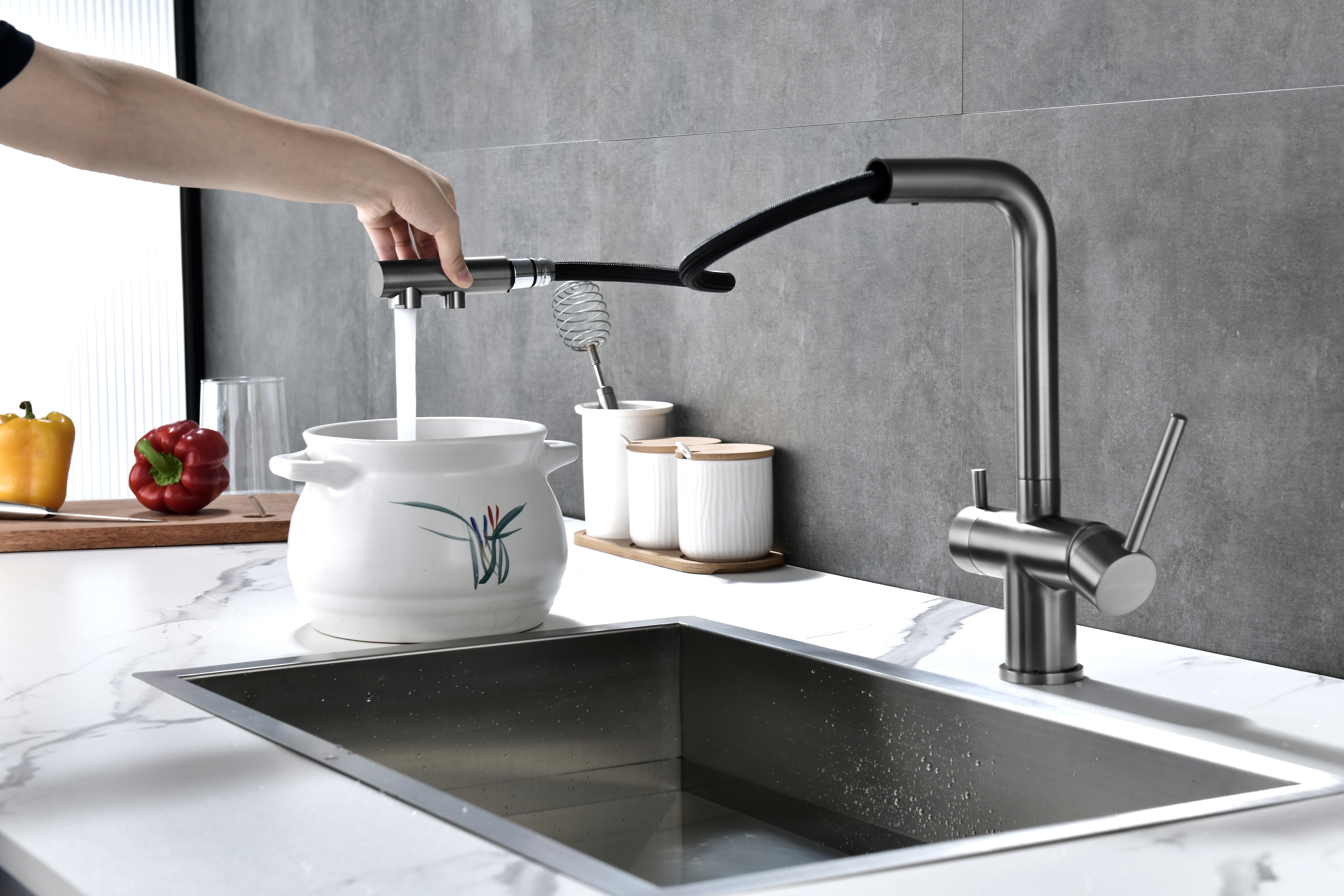 Смеситель оснащен гибким выдвижным изливом из нейлоновой оплетки, которая обладает отличной устойчивостью к истиранию и разрушению. Данная техническая особенность расширяет рабочую зону смесителя, позволяя пользоваться им с удобством в больших мойках, мойках с двумя чашами, или наполнять водой ёмкость на столе рядом с мойкой, в том числе питьевой водой.