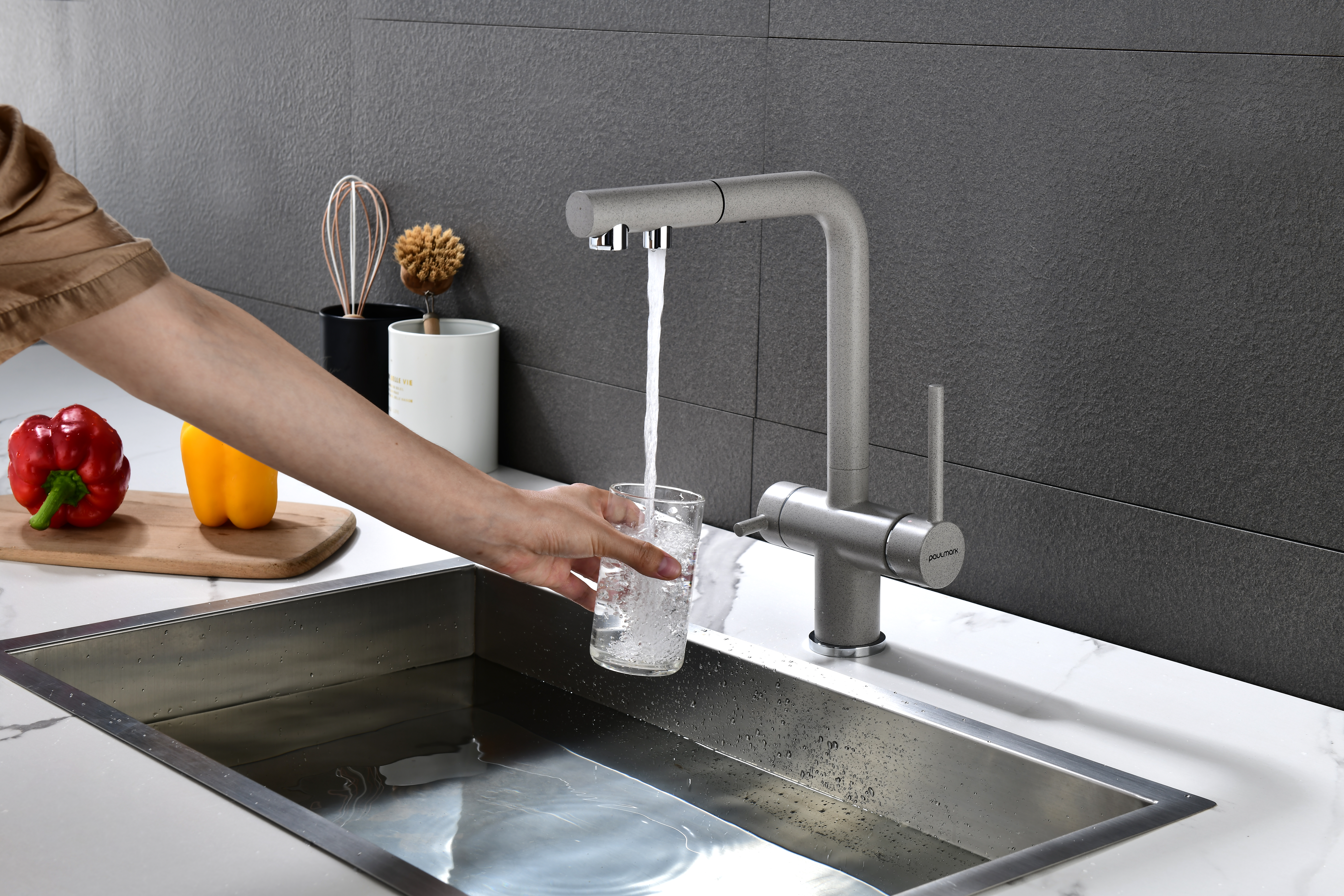 SERPENTINE оснащён функцией TRINKWASSER - излив смесителя имеет встроенный независимый канал для питьевой воды из фильтра, таким образом питьевая и водопроводная вода не смешиваются. Управление питьевой водой осуществляется отдельным рычагом, расположенным слева. Для пуска водопроводной воды используется большой рычаг справа.