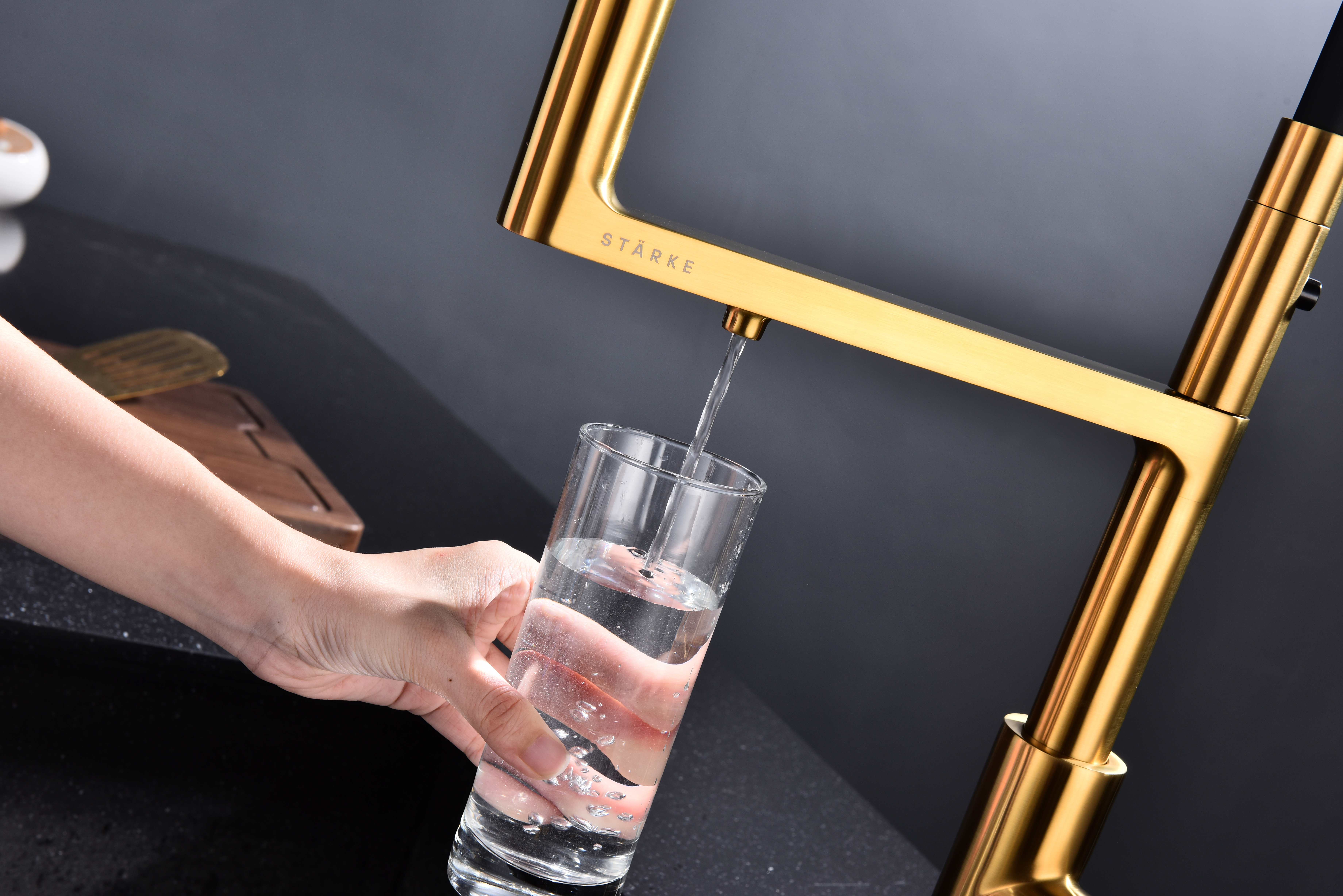 TORNADO оснащён функцией TRINKWASSER – в смесителе присутствует встроенный независимый канал для питьевой воды из фильтра, которая подается из отдельного аэратора на латунной части излива. Водопроводная вода подаётся из гибкого силиконового излива. Управление питьевой водой производится рычагом слева. Рычаг справа управляет подачей водопроводной воды. Совмещение подачи питьевой и водопроводной воды в одном смесителе избавляет от необходимости ставить дополнительный кран и позволяет сделать зону мойки максимально эстетичной.