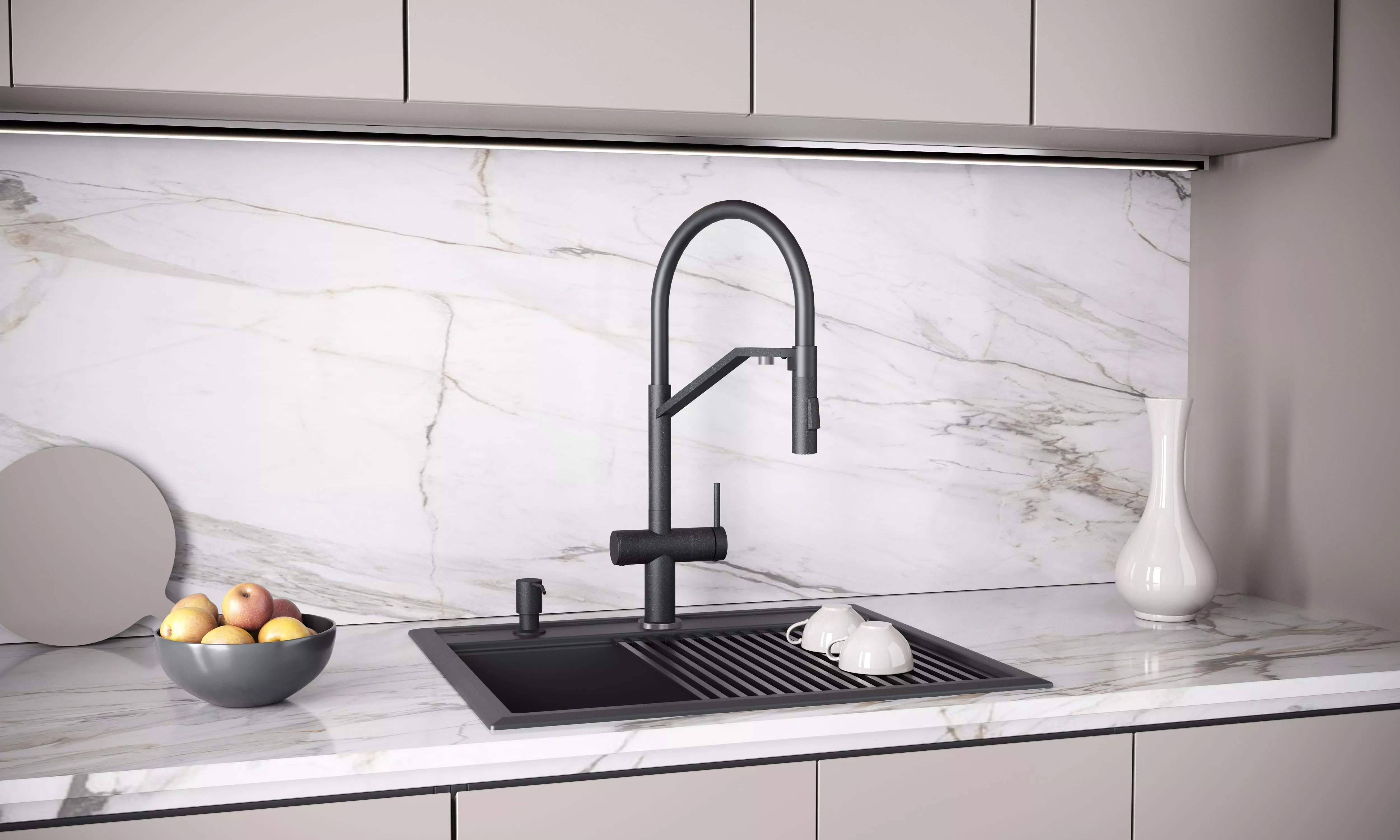 Многофункциональный смеситель для кухни ZENDER оснащен функциями подключения фильтра питьевой воды и гибким силиконовым изливом с двумя режимами подачи водопроводной воды: струя и душ. Для переключения между этими режимами предусмотрена удобная кнопка на конце излива. Управление подачей очищенной питьевой воды осуществляется поворотом специальной ручки, расположенной слева и имеющей декоративные лазерные насечки, при этом вода подается через отдельный аэратор.